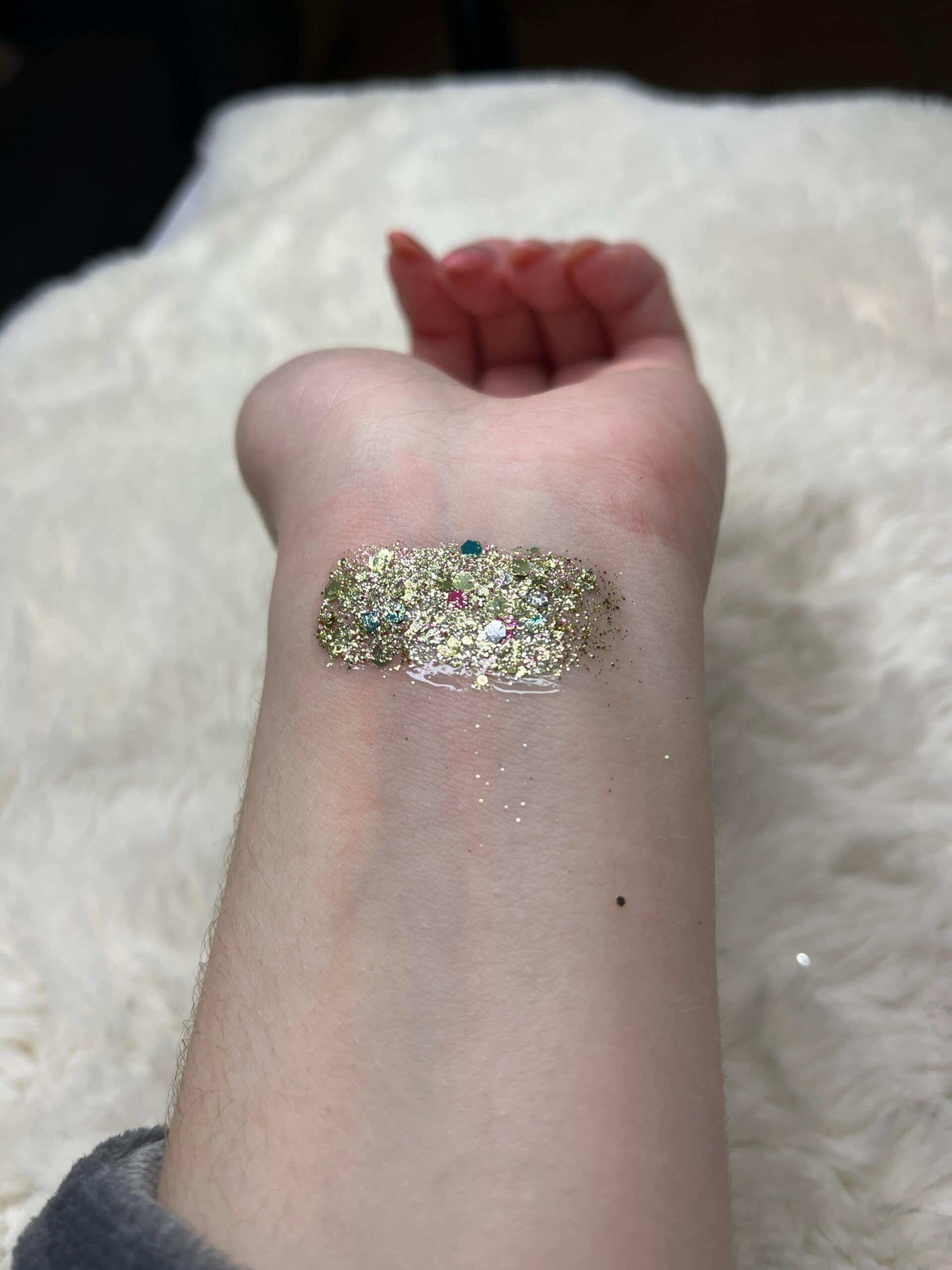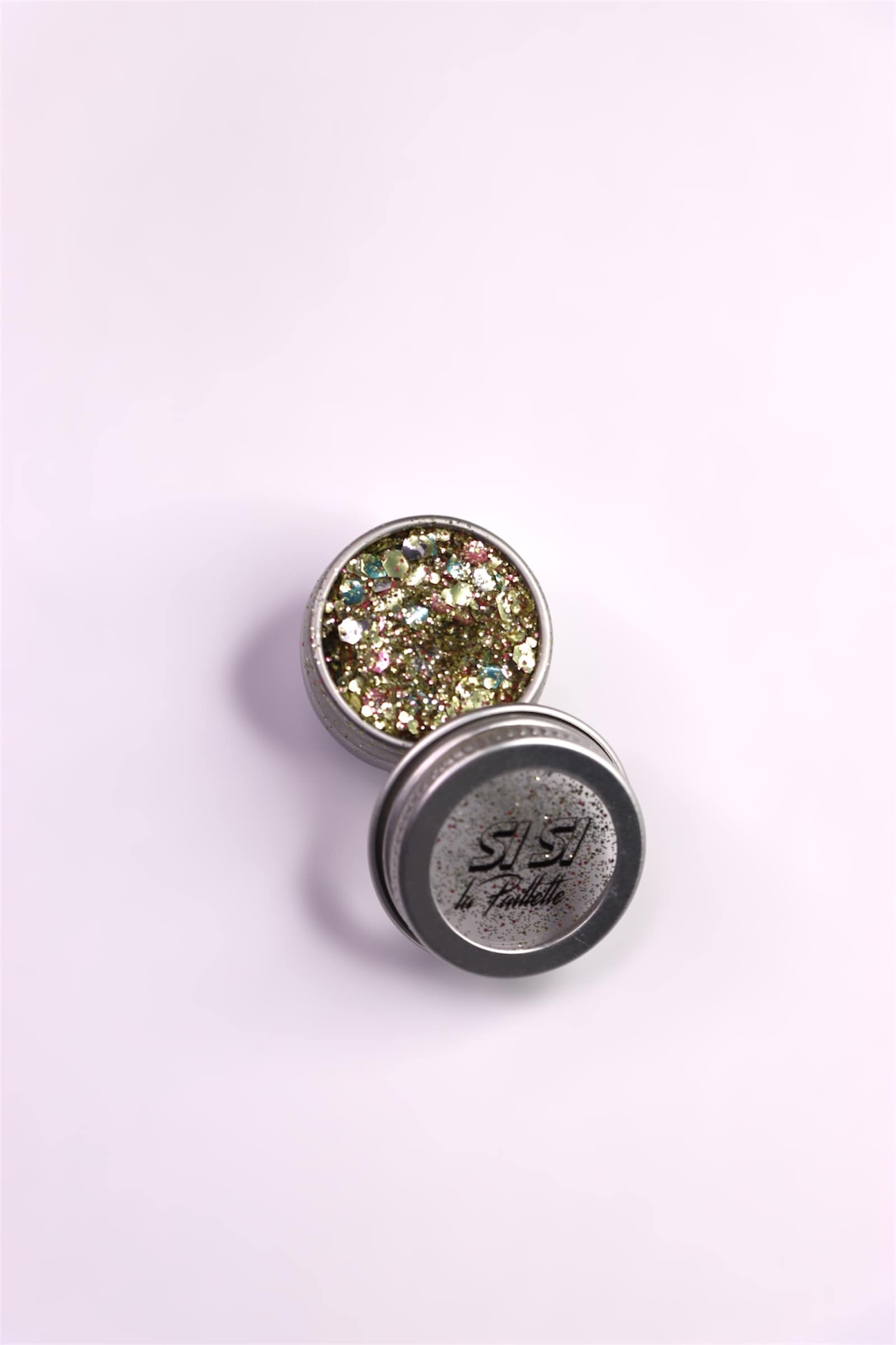 Un mélange de paillettes à base de plantes Baronne du Dimanche aux couleurs dorées, relevées de touches roses, turquoises et argentées et de toutes les tailles pour toujours plus de brillance !