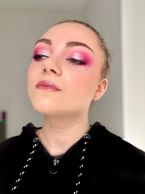 Une interprétation contemporaine du demi cut crease. La paupière mobile est illuminée par une base claire, contrastée par un rose intense placé en externe pour sculpter le regard. La transition reste nette, volontairement graphique. Le gloss sur les lèvres équilibre la composition et apporte une dimension plus moderne. Ce maquillage met l’accent sur la structure et la précision : une construction propre, lisible, pensée pour l’image.